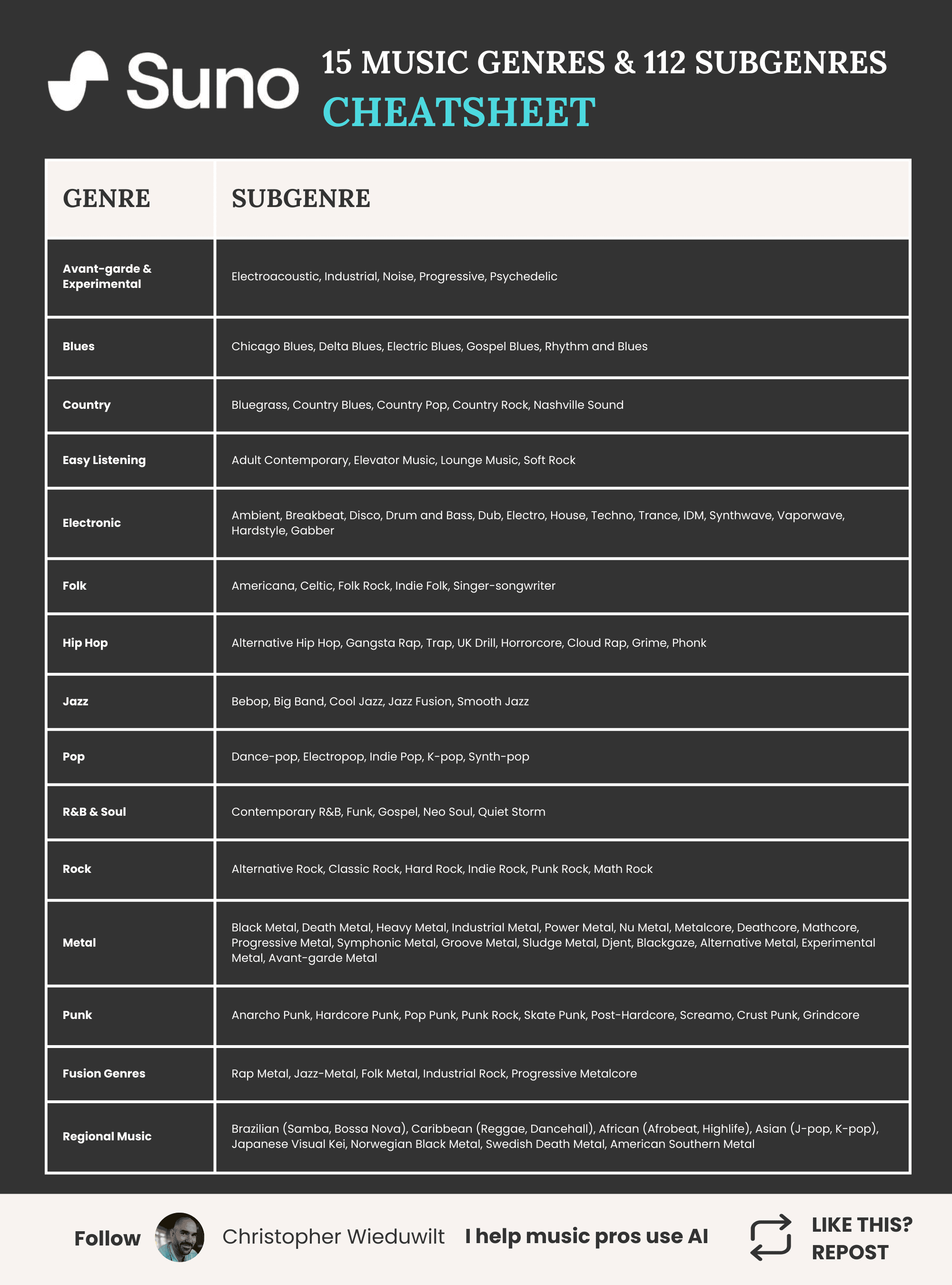 | Metal | Black Metal, Death Metal, Heavy Metal, Industrial Metal, Power Metal, Nu Metal, Metalcore, Deathcore, Mathcore, Progressive Metal, Symphonic Metal, Groove Metal, Sludge Metal, Djent, Blackgaze, Post-Metal, Alternative Metal, Experimental Metal, Avant-garde Metal |
