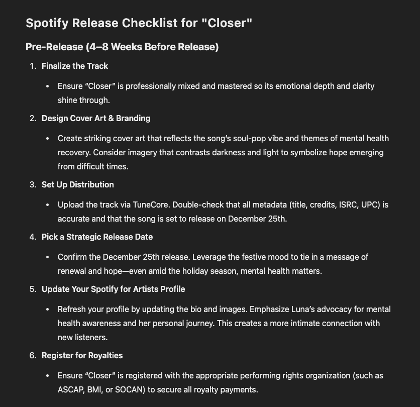 - Customized Spotify Release Strategy: Delivers a tailored checklist for an artist’s upcoming song release, factoring in song details, distribution platform, social media channels, marketing budget, and special promotion plans.