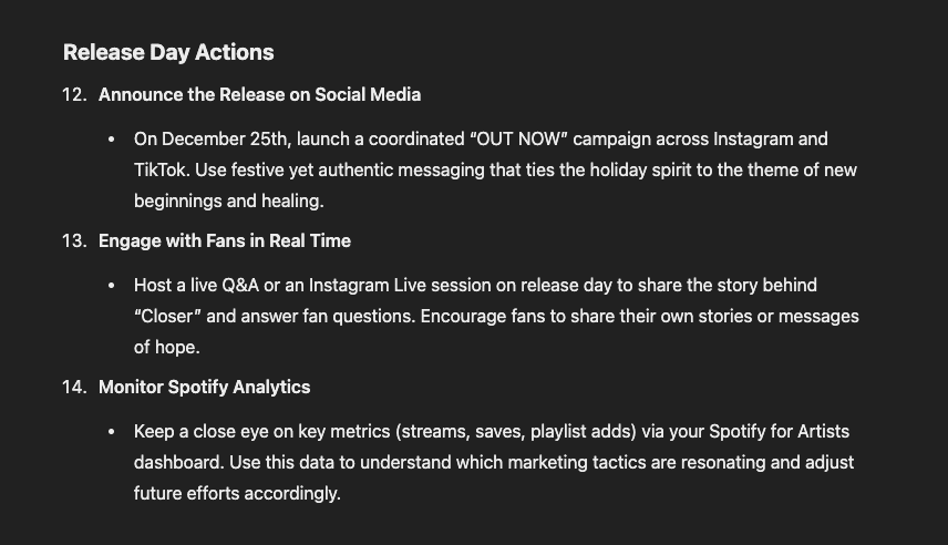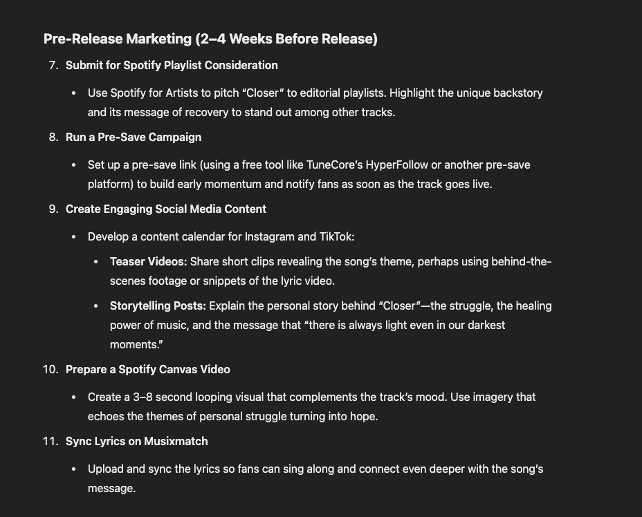 - Actionable Steps: Provides specific, actionable tasks such as finalizing the track, designing cover art, pitching to Spotify playlists, running pre-save campaigns, and monitoring analytics.