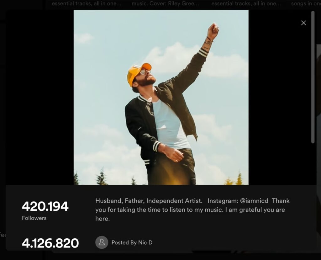 “Husband, Father, Independent Artist. Instagram: @iamnicd Thank you for taking the time to listen to my music. I am grateful you are here.”