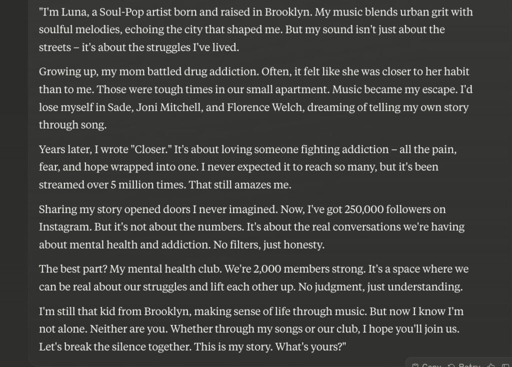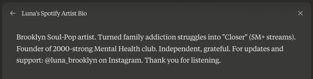 Look at this: The revised bio now now showcases both musical success (5m+ streams) and social impact (Mental Health club), creating a multi-faceted personal brand. It’s more engaging, relatable, and provides a call-to-action (follow on Instagram), aligning with effective personal branding strategies.