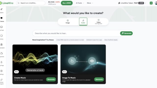 Limewire AI Music Studio uses AI to automatically generate fully original music compositions from text or image inputs. No music skills needed to make your ideas into tracks.