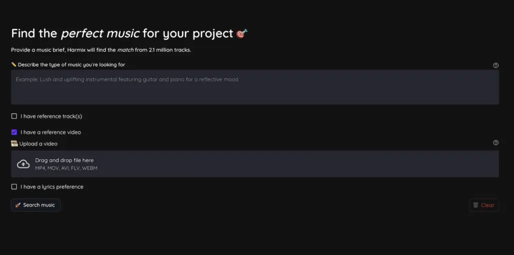 This isn’t just a fancy search tool. Harmix allows you to upload a video, specify an emotion via text, upload a reference track, add a song narrative, and find music that meets all your requirements.