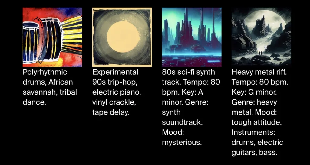 → “Polyrhythmic drums, African savannah, tribal dance.”