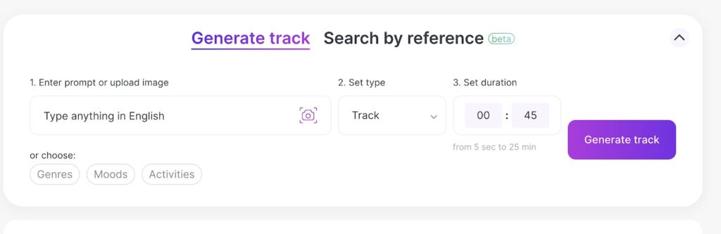 - Generate: Click the purple “Generate track” button to create your AI-composed music.