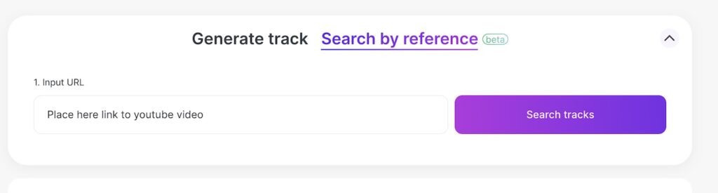 - Search Tracks: Click the purple “Search tracks” button to have Mubert analyze the reference and generate similar tracks.