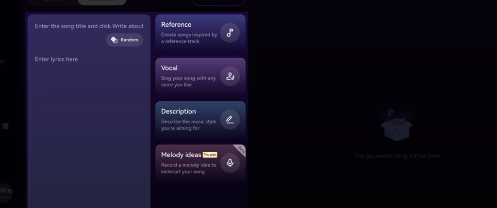 2. Input your lyrics or click “Random” to let Mureka generate lyrics for you