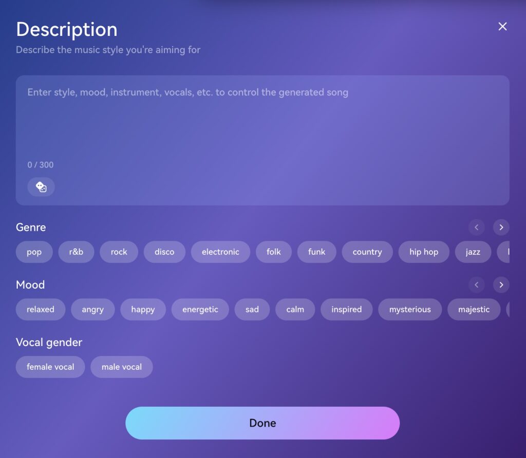 - Mood Options: Select emotions like Relaxed, Happy, Energetic, Sad, or Mysterious