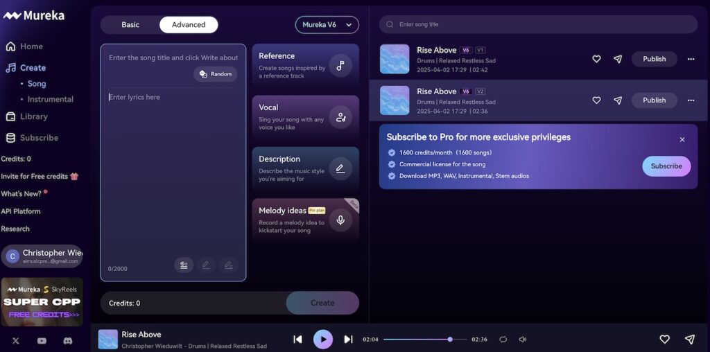 Navigate to Mureka and sign up for a free account. The free plan allows you to generate 1.