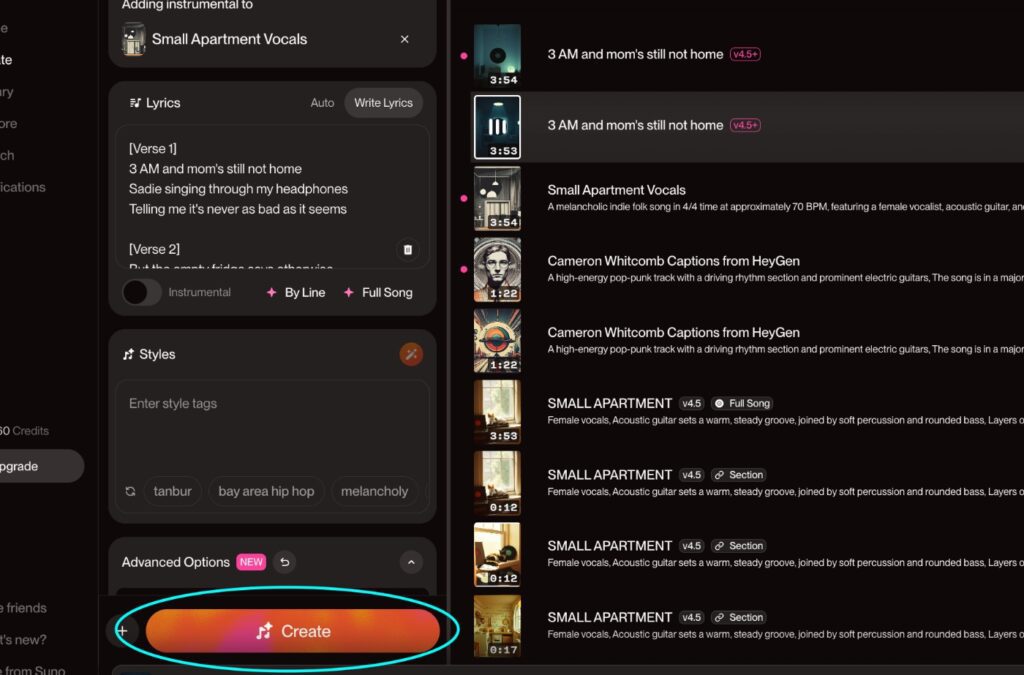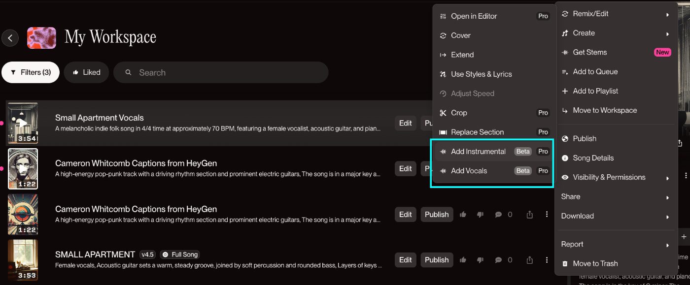 Start with simple experiments using the Add Vocals or Add Instrumentals features. Once you’re comfortable with the basics, explore the Inspire function to create songs that match your favorite musical styles.