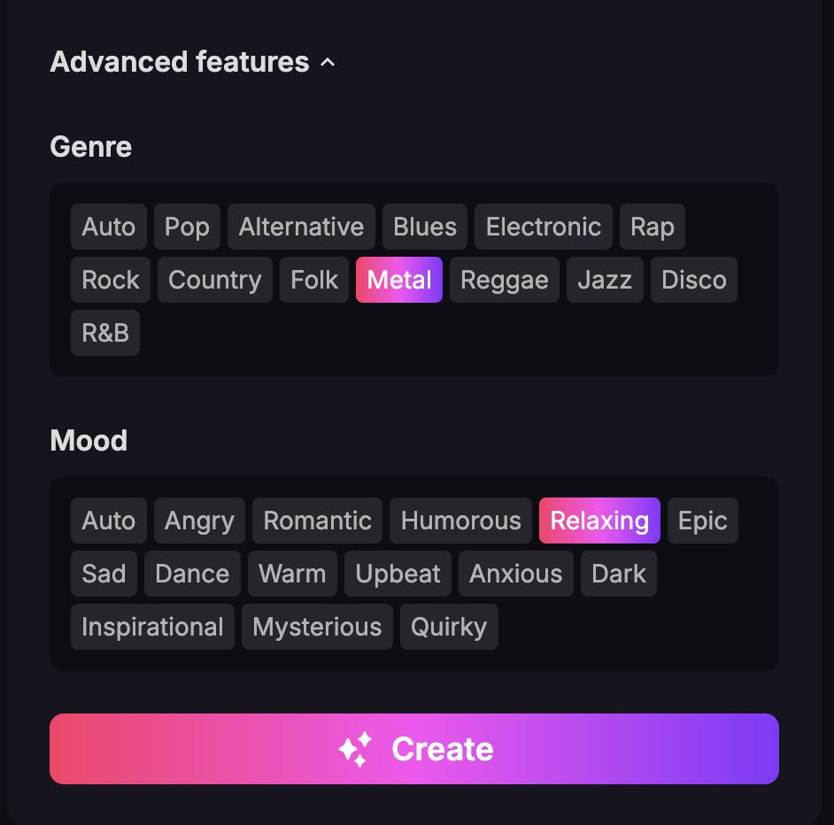 Tad.ai offers a diverse range of genres—from pop and rock to folk and electronic. You can also select the mood that fits your project, whether that’s upbeat and quirky or warm and relaxing. The possibilities are endless, giving you the creative freedom to produce music that truly resonates with your vision.