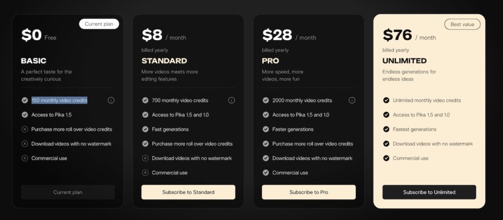 - PIKA: Offers a Free Plan with 30 credits, equivalent to 9 seconds of video, allowing you to experiment with its basic features.