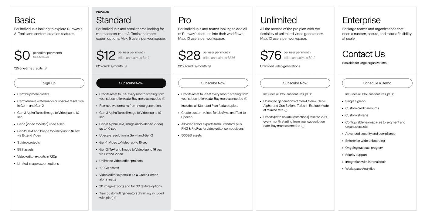 - RunwayML: Includes a Basic free plan with 125 credits, allowing you to generate up to 25 seconds of video or 25 image generations.