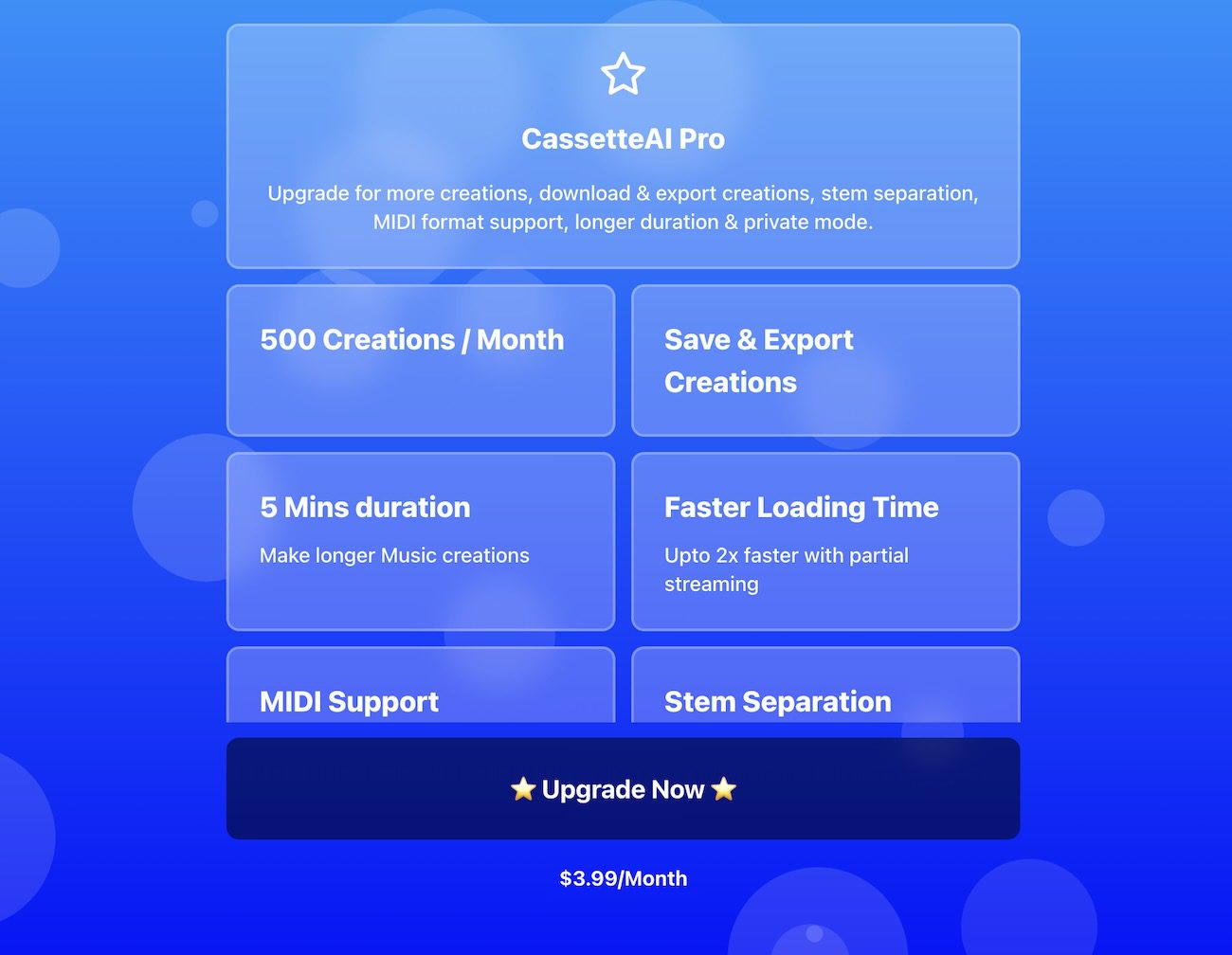 Cassette AI offers a free plan with limited features, allowing you to experiment with the platform and create basic music tracks. For more advanced features and unlimited music generation, you can subscribe to a paid plan starting from $3.99/month.