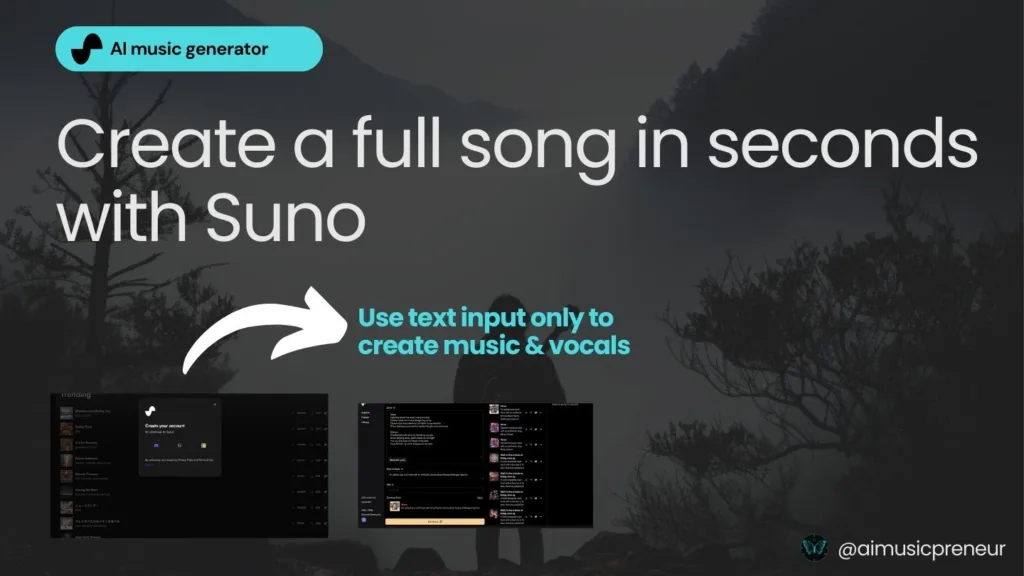 Go to Suno's website, log in through Google/Microsoft/Discord, input a text description or lyrics for your desired song, and let the AI generate a complete track within seconds.